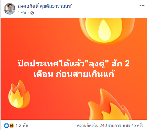 เต้ มงคลกิตติ์ โพสต์แนะ พลเอก ประยุทธ์ รีบปิดประเทศกัน โควิด 19 ระบาด โดยด่วนเป็นเวลา 2 เดือน ก่อนจะสายเกินแก้ เชื่อเป็นผลดีต่อประเทศ