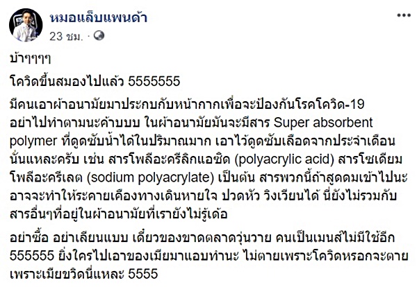ล่าสุด (23 มีนาคม 2563) เฟซบุ๊ก หมอแล็บแพนด้า ได้ออกมาโพสต์ให้ความรู้เกี่ยวกับประเด็นที่มีผู้ใช้ผ้าอนามัยแทนหน้ากาก เพื่อป้องกัน COVID-19 ระบุว่า ไม่ควรทำตาม เนื่องจากผ้าอนามัยมีสาร Super absorbent polymer ที่ดูดซับน้ำได้ในปริมาณมาก เพื่อเอาไว้ดูดซับเลือดจากประจำเดือน เช่น สารโพลีอะคริลิกแอซิด (Polyacrylic acid) สารโซเดียมโพลีอะคริเลต (Sodium polyacrylate) เป็นต้น