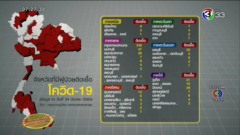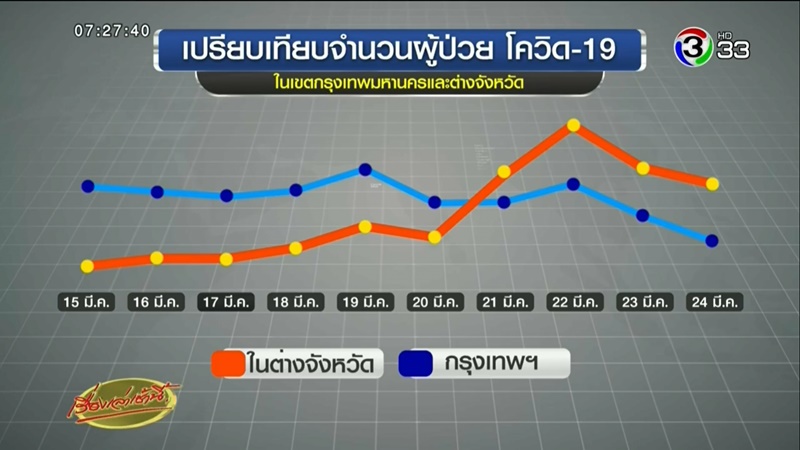 อย่างไรก็ตาม ข้อมูลยอดผู้ป่วยวันที่ 24 มีนาคม จะเห็นได้ว่าจังหวัดอื่น ๆ มียอดรวมผู้ป่วยสะสม 478 ราย ขณะที่กรุงเทพมหานคร อยู่ที่ 349 ราย