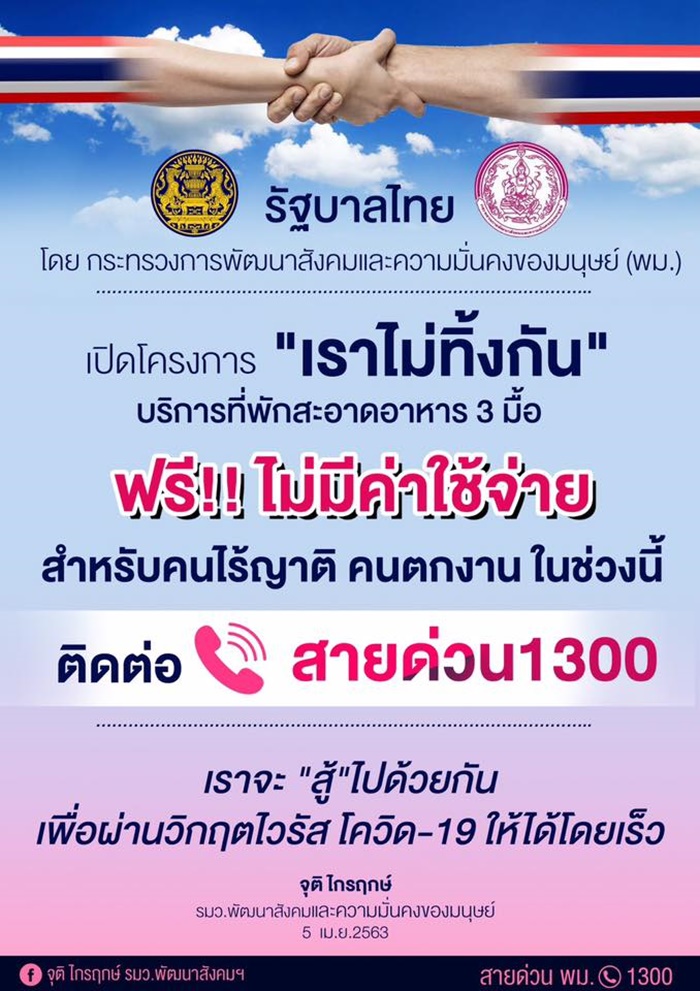 พม. จัดโครงการ "เราไม่ทิ้งกัน" บริการที่พักสะอาด อาหารฟรี 3 มื้อ พร้อมช่วยเหลือคนไร้ญาติ คนตกงานช่วงนี้ สู้วิกฤตโควิด 19 ไปด้วยกัน