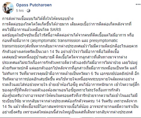 ดังนั้น ทาง นพ.โอภาส โพสต์ทิ้งท้ายว่า หากกลับมาจากต่างประเทศยังไงก็ต้องกักตัวครบ 14 วัน เพื่อลดโอกาสการแพร่กระจายเชื้อไวรัสโคโรน่า อีกทั้งช่วงหลังมานี้ คนที่ติดเชื้อส่วนใหญ่มักเกิดจากคนที่เดินทางกลับจากต่างประเทศ
