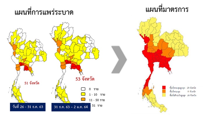 - ขั้นที่ 1 : จำกัดเวลาเปิด-ปิดสถานประกอบการ ปิดสถานที่เสี่ยง จับกุมผู้ที่มั่วสุมผิดกฎหมาย ห้ามรวมกลุ่มคน ปิดโรงเรียน สอนออนไลน์ ไม่เดินทางข้ามจังหวัด Work from Home ค้นหาผู้ติดเชื้อเชิงรุก